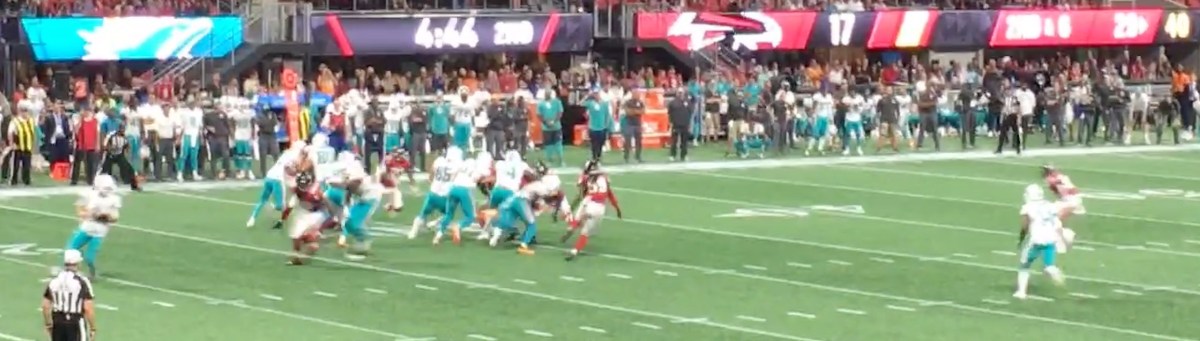 As the 4th quarter begins, the Falcons drive up to midfield, then implode.  Jake Matthews gets a holding call.  Freeman gets no yards.  Ryan is sacked.  THEN the capping blow.  Bosher doesn’t even have a chance for a bad punt because Josh Harris has a low snap, Bosher runs for a yard or two and Miami has the ball at the 50.