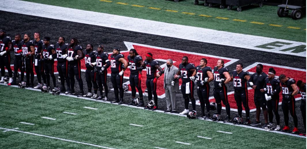 The National Anthem is played by saxophonist, Mike Phillips and the Atlanta Falcons team and coaches stood locked arm in arm. The roof is open providing sun and warmth to the field.