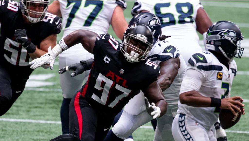 A quick run on 1st down gains 4 yards. Wilson drops back and hits Chris Carson for another first down, immediately stopped by Keanu Neal on his first hit of the year. Grady Jarrett pressures Wilson, but he scrambles out and finds Carson for 6 yards where Foye Oluokun stops him. A rushing first down moves the Seahawks to the Falcons 38. Wilson scrambles and hits Lockett near the sideline, again, covereed by 34. Isaiah Oliver has DK Metcalf covered perfectly so that Wilson can’t throw his way. A holding call is called on an offensive lineman, backing the Seahawks up.