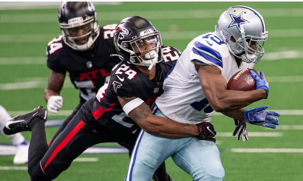 After a fake handoff, Prescott finds Cooper who forces a missed tackle by Denard. Terrell brings him down. Michael Gallup has his first catch of the day after getting way away from Isaiah Oliver, but Kazee makes the stop. After a holding call on an offensive lineman with his hand on Jarrett’s facemask and jersey, Dallas has a 1st and 20 from the 27. The pass is incomplete, Oliver knocking it out. On 2nd and 20, there is a false start moving the offense back to a 2nd and 25. Prescott finds Elliott for a 6-yard reception.