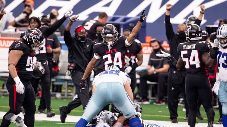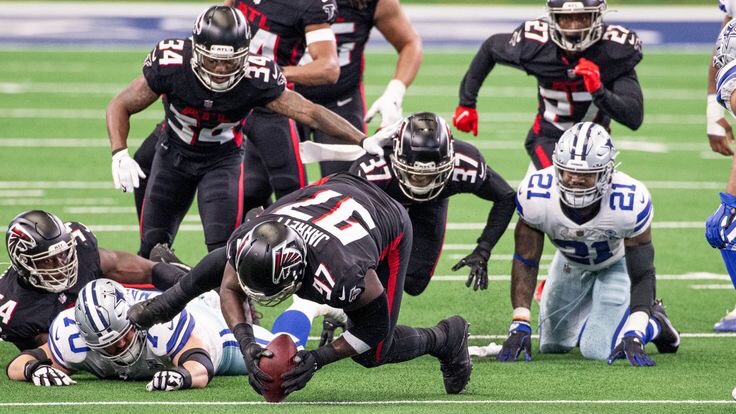 The Cowboys have a penalty on the kickoff and will begin on their own 13. A four-man rush and a Prescott quick pass to Schultz, who is stopped by Oluokun. On 1st and 10, a handoff way in the backfield to Elliott, Jarrett is immediately in the backfield for the tackle, with McKinley inches away to assist. Prescott from the gun, good protection with a rushing defense and he finds CeeDee Lamb to gain some yards back. On 3rd and 3, showing blitz, but then pull back and with a 4-man rush, the Falcons get to Prescott who cannot get the pass off and is incomplete. A fake punt is tried, but the punter cannot get the ball to the sliding receiver and the Falcons take over on the Dallas 29.
