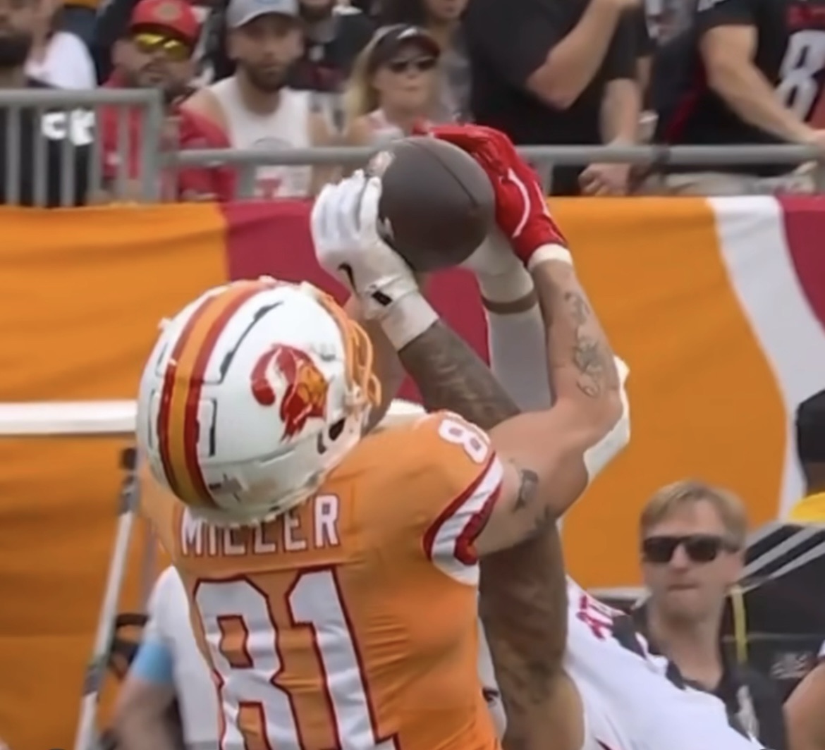 Arch was surprised that Buccaneers’ quarterback Baker Mayfield tried Jessie on that interception. Jessie walked us through it. It was a flea flicker with the down safety in zone. They jumped the motion and Micheal Hughes was on the post as the WIL, so Jessie knew the ball was coming. He simply tracked it and picked it out of the air. Which is not completely accurate, Jessie picked it right out of the hands of the receiver.