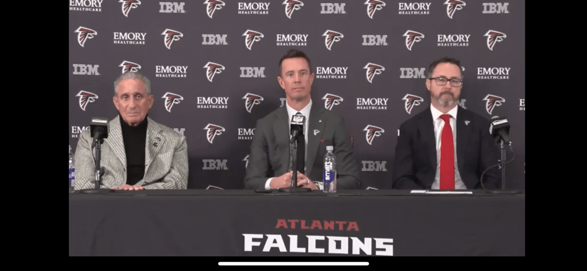 The introductory press conference begins with the seating of President and CEO of the Atlanta Falcons, Greg Beadles, President of Football, Matt Ryan, and Owner, Arthur Blank.