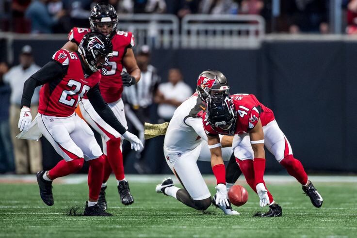 Bernhardt returns the kick off 27 yards to the Falcons’ 24. Franks fakes the handoff, runs himself for 4 yards. Allgeier runs up the middle for 2 yards, then Franks scrambles for 8 yards along the right side, lowers the shoulder and takes the hit to go out of bounds. Shaffer with the false start, from the 32, Allgeier runs out of bounds for 5 yards, but offensive holding backs the Falcons up to a 1st and 25 from the 22. From the shotgun, Franks hands off to Allgeier, who goes up the middle, but a flag for illegal shift. Now, 1st and 30 from the 17, Franks runs up the middle, gets hit and fumbles the ball. His knee was marked down and continues the offensive drive. On 2nd and 18 from the 30, Franks fakes the handoff and runs, puts his head down and runs into two defenders, gaining 10 yards. With a 3rd and 8, Atlanta calls time out.